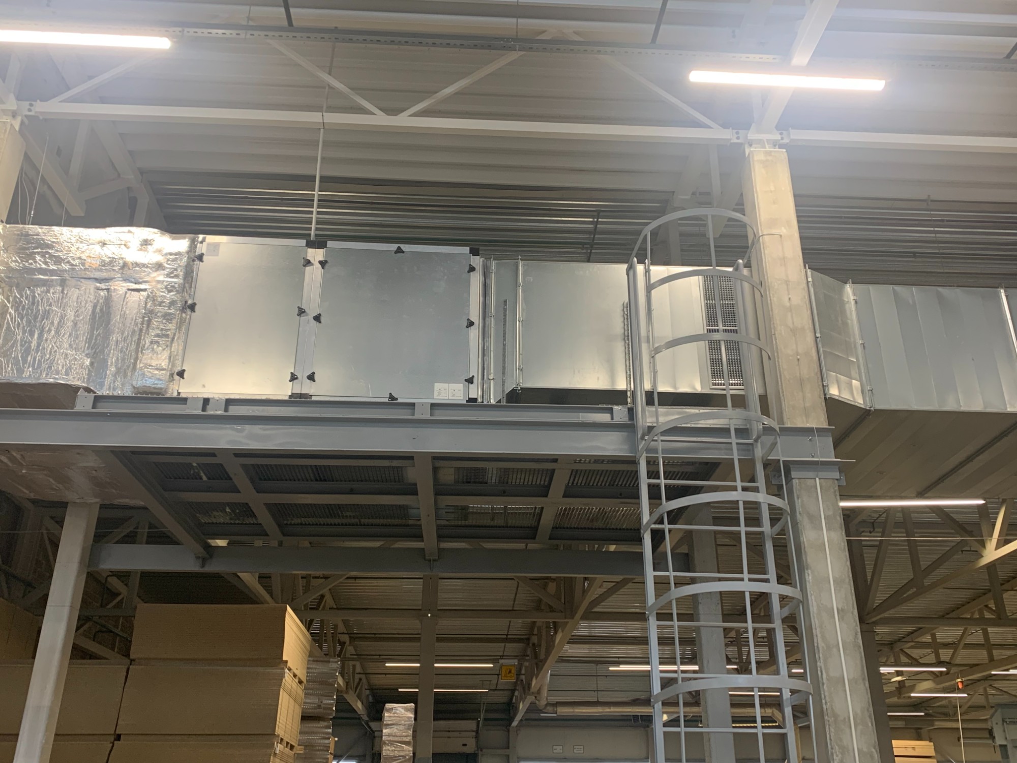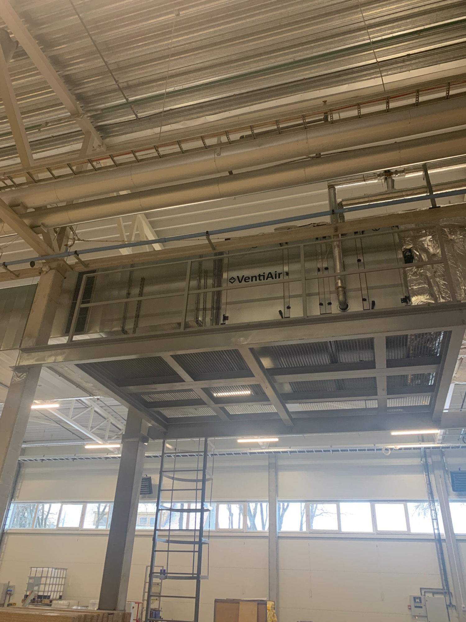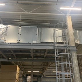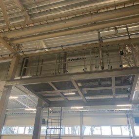 - Sumontuota VentiAir STA-220681 STYPE® S300 S/L oro tiekimo kamera (23 000 m³/h) su vandeniniu šilumokaičiu, užtikrinanti šviežio oro tiekimą ir vakuumo kompensavimą