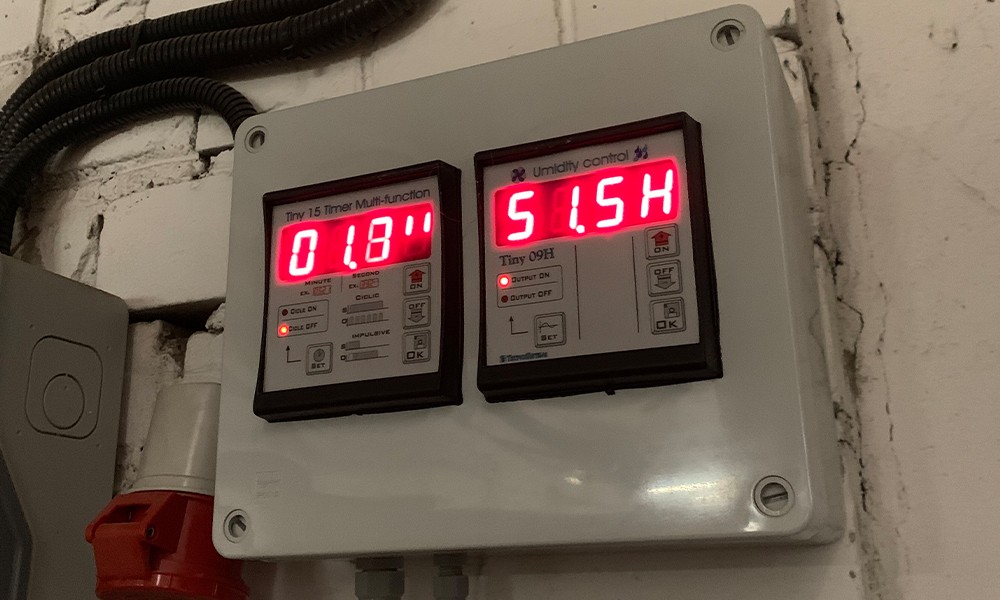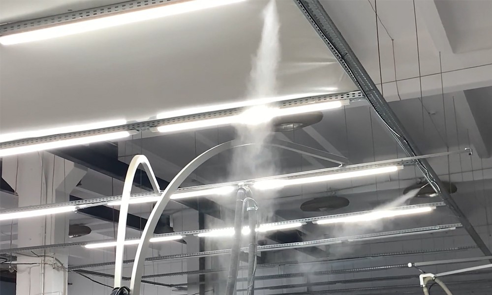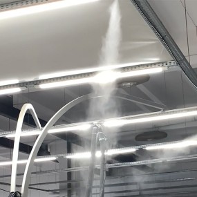 Parinkta ir įrengta aukšto slėgio drėkinimo sistema Idrobase FOG 60 (2 l/min), pritaikyta 6900 m³ patalpai. Sumontuoti 35 purkštukai, užtikrinantys tolygų dulksnos paskirstymą visoje gamybinėje erdvėje. Sistema valdoma STOP&GO valdikliu, leidžiančiu reguliuoti purškimo intensyvumą ir intervalus. Papildomai integruota vandens minkštinimo sistema ilgaamžiškumui užtikrinti bei drėgmės jutiklis realiam stebėjimui.
