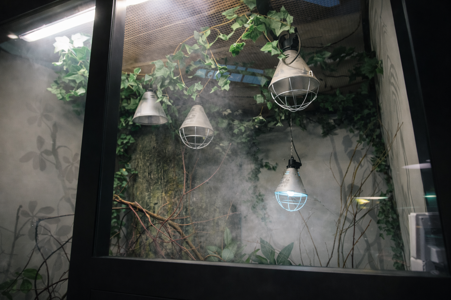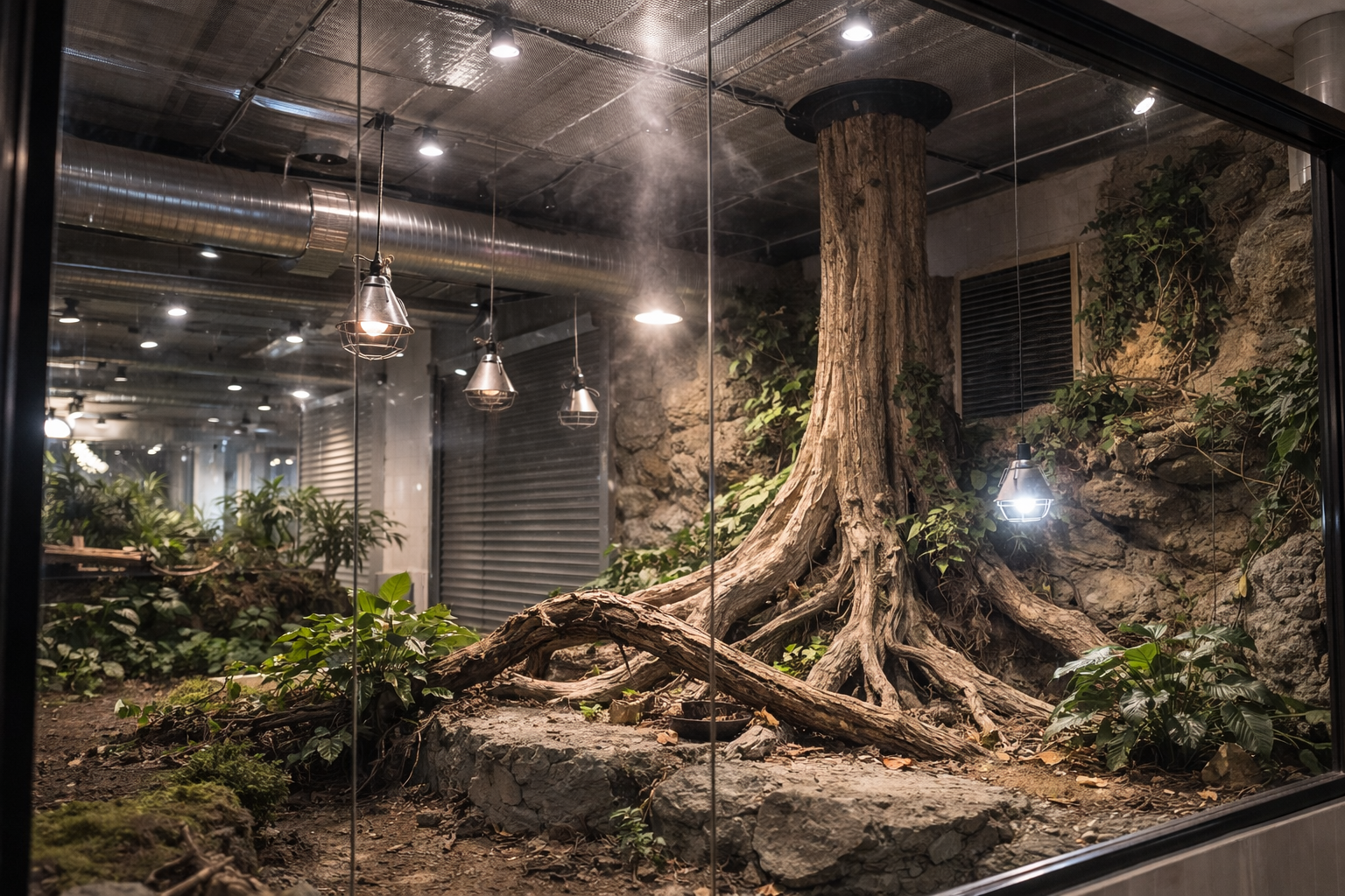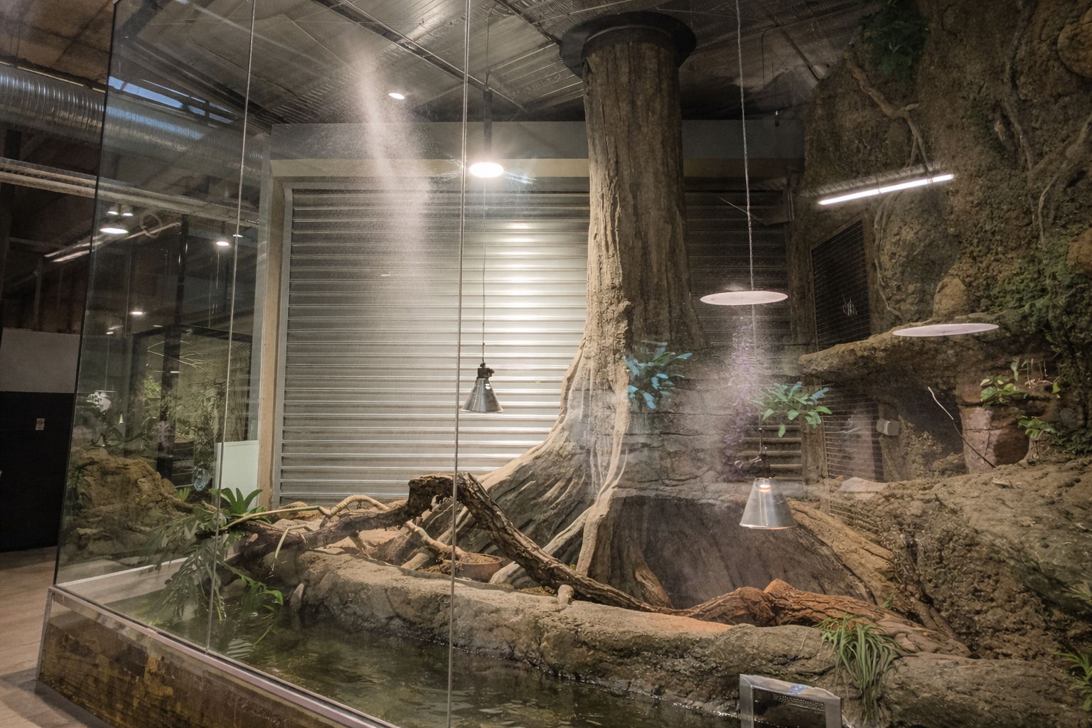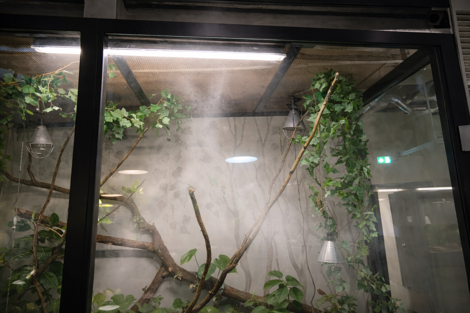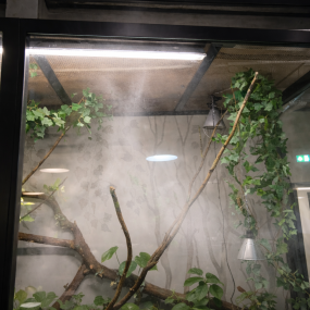 Įrengta drėkinimo sistema su Idrobase Ambiente siurbliu (1 l/min našumas) ir 30 purkštukų, integruotų į roplių akvariumus, užtikrinanti tolygų ir nuolatinį drėgmės palaikymą.