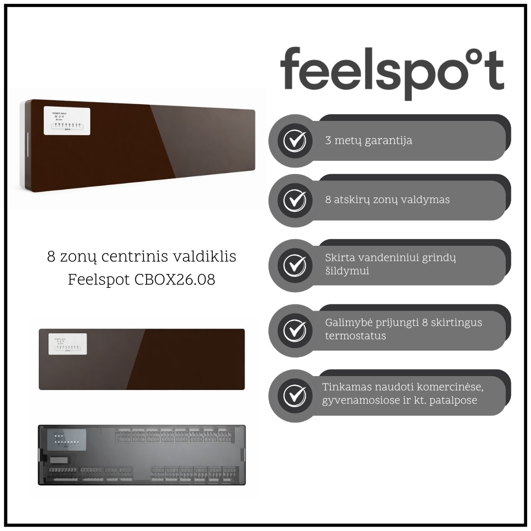 8 zonų laidinis centrinis valdiklis Feelspot CBOX26.08 – tai patikimas ir efektyvus sprendimas vandeninio grindinio šildymo sistemų valdymui. Įrenginys leidžia tiksliai reguliuoti temperatūrą skirtingose patalpų zonose, užtikrinant tolygų šildymą, didesnį komfortą ir mažesnes energijos sąnaudas.