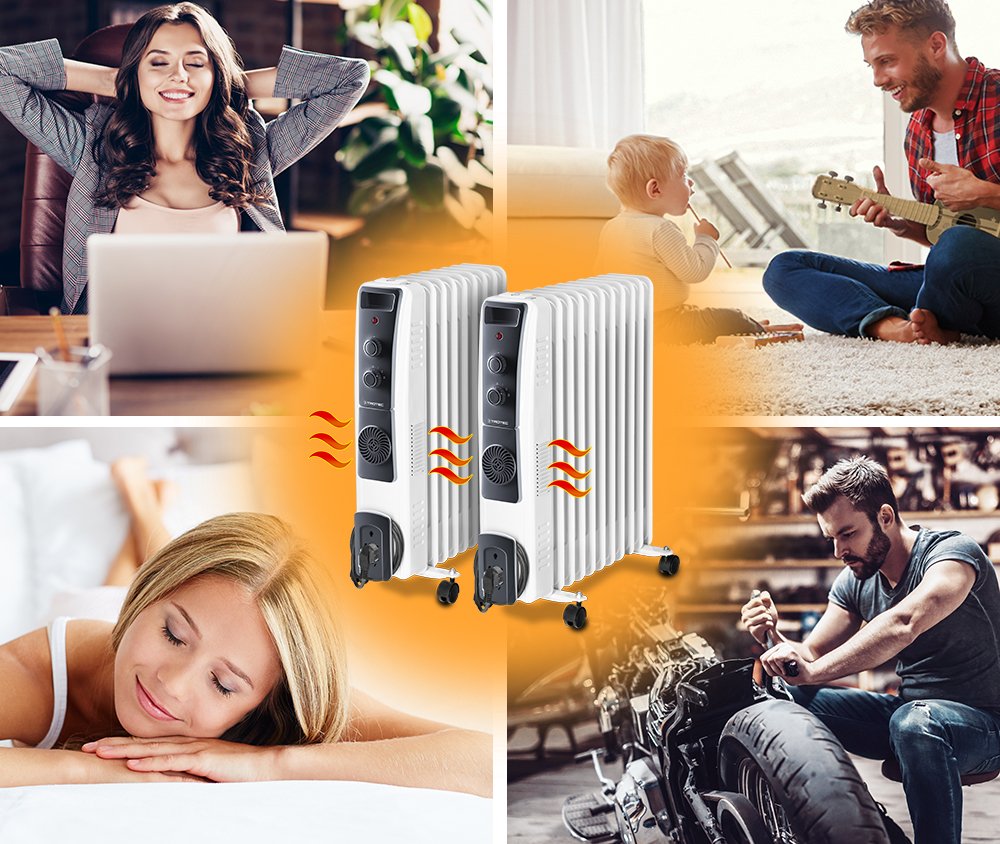 Dėl 3 reguliuojamų šildymo galingumo, reguliuojamu termostatu galite nustatyti norimą temperatūrą: nuo 10 iki 35 °C. Tepaliniai radiatoriai veikia visiškai tyliai, be jokio kvapo ir nesukelia dulkių. Dėl viduje esančio integruoto keramikinio ventiliatoriaus, šildomose patalpose dar greičiau pasklinda šiluma. Taipogi, elektrinis tepalinis radiatorius pasižymi dvigubo šildymo technologija, kurią sudaro ilgalaikė skleidžiama radiatoriaus šiluma bei papildomai įjungtas karšto oro ventiliatorius.