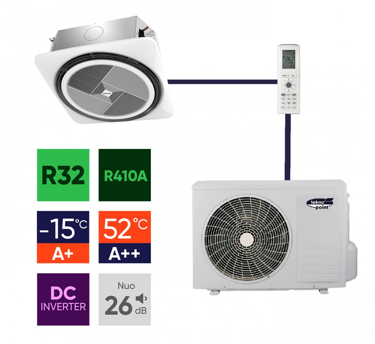 Komerciniai kasetiniai kondicionieriai / šilumos siurbliai Tekno Point pasižymi aukštu efektyvumu. Blokus galima rinktis kompaktiško dydžio su stačiais kampais, kuriuos patogu sumontuoti į „Armstrong“ tipo lubas arba standartinius - didesnių matmenų, užapvalintais kampais. Visuose blokuose yra sumontuoti 7 greičių reguliuojami ventiliatoriai, kondensato siurbliukas ir nuotolinis valdymo pultas.