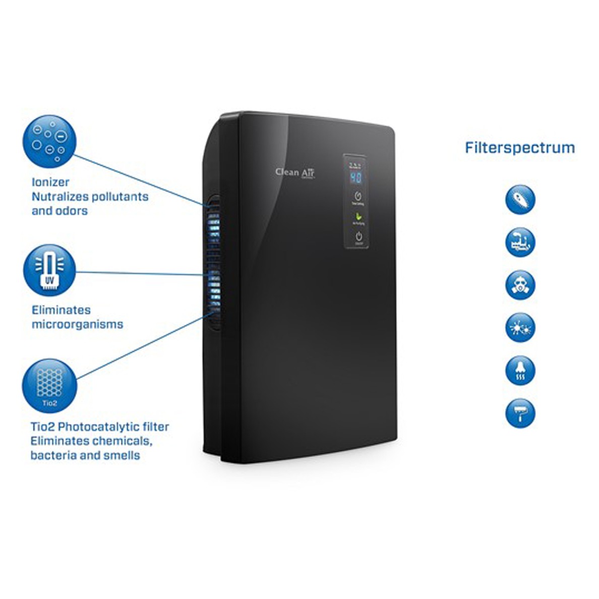 - Filtravimo technologijos: jonizatorius, UV LED, fotokatalizinis filtras