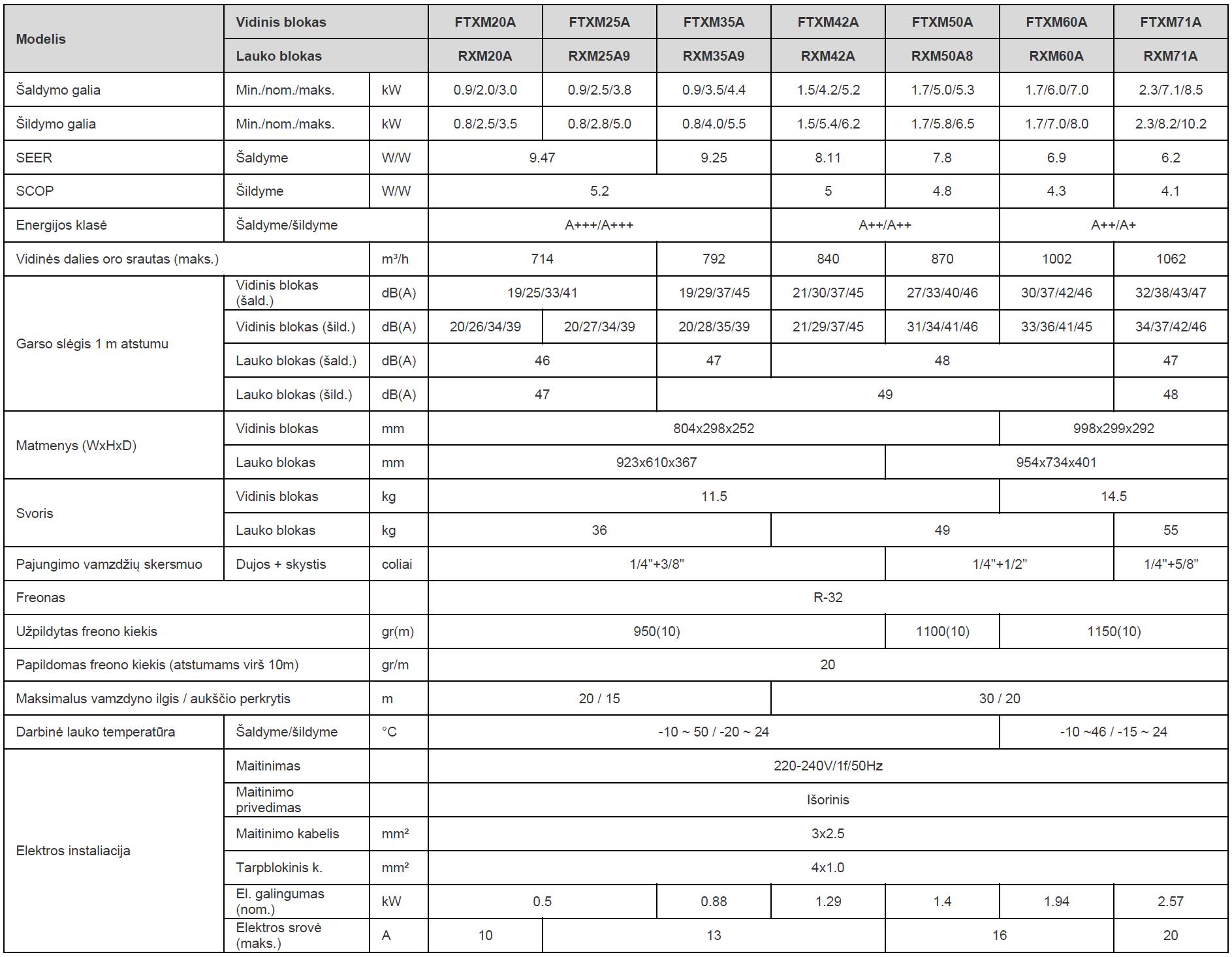 - Išorinio bloko garso slėgis (1 m atstumu): 46–49 dB(A)