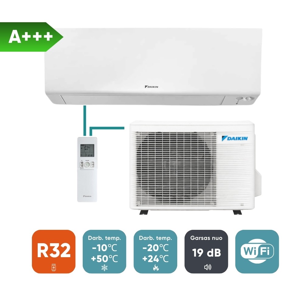 Split oro kondicionierius (oras–oras šilumos siurblys) Daikin Perfera (komplektas) – tai pažangus sprendimas, skirtas komfortiškam ir sveikam patalpų mikroklimatui užtikrinti. Komplektą sudaro suderinti vidinis ir lauko blokai, kurie užtikrina efektyvų patalpų vėsinimą ir šildymą bei stabilų veikimą ištisus metus.