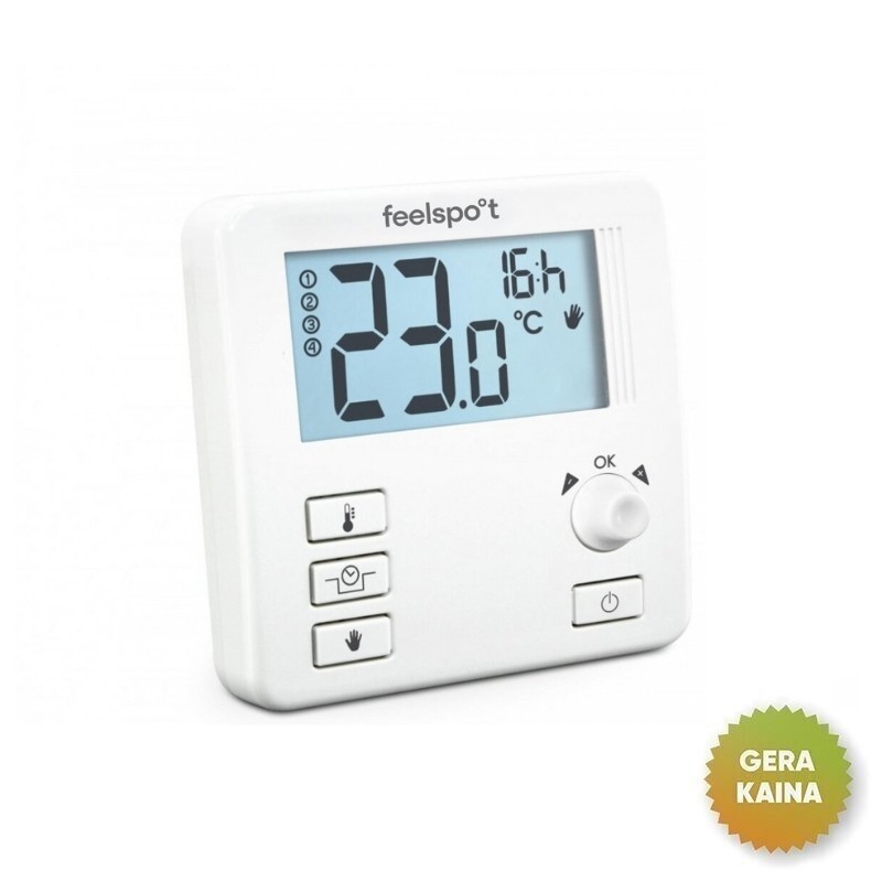 Virštinkinis neprogramuojamas termostatas (termoreguliatorius) Feelspot WTH31.16 skirtas naudoti su visais šildymo ir kondicionavimo įrenginiais. Termostatas Feelspot WTH31.16 yra paprastai montuojamas ant sienos, todėl derės prie įvairių interjero dizaino sprendimų. Neprogramuojamas termostatas pasižymi lengvu valdymu – vos kelių mygtukų paspaudimu nustatykite valdomos zonos temperatūrą ar laikiną temperatūros sumažinimo rėžimą (plačiau skaityti instrukcijoje). Taip pat, šis Feelspot WTH31.16 termostatas taupo elektros energiją. Virštinkinis neprogramuojamas termostatas (termoreguliatorius) Feelspot WTH31.16 yra maitinamas 2 vnt. AAA tipo baterijomis. Įmontuotas jungiklis, leidžiantis lengvai ir bet kuriuo metu išjungti termostatą. Neprogramuojamas termostatas Feelspot WTH31.16 turi LCD ekraną, kuriame rodoma esama patalpos temperatūra bei nustatyta temperatūra.